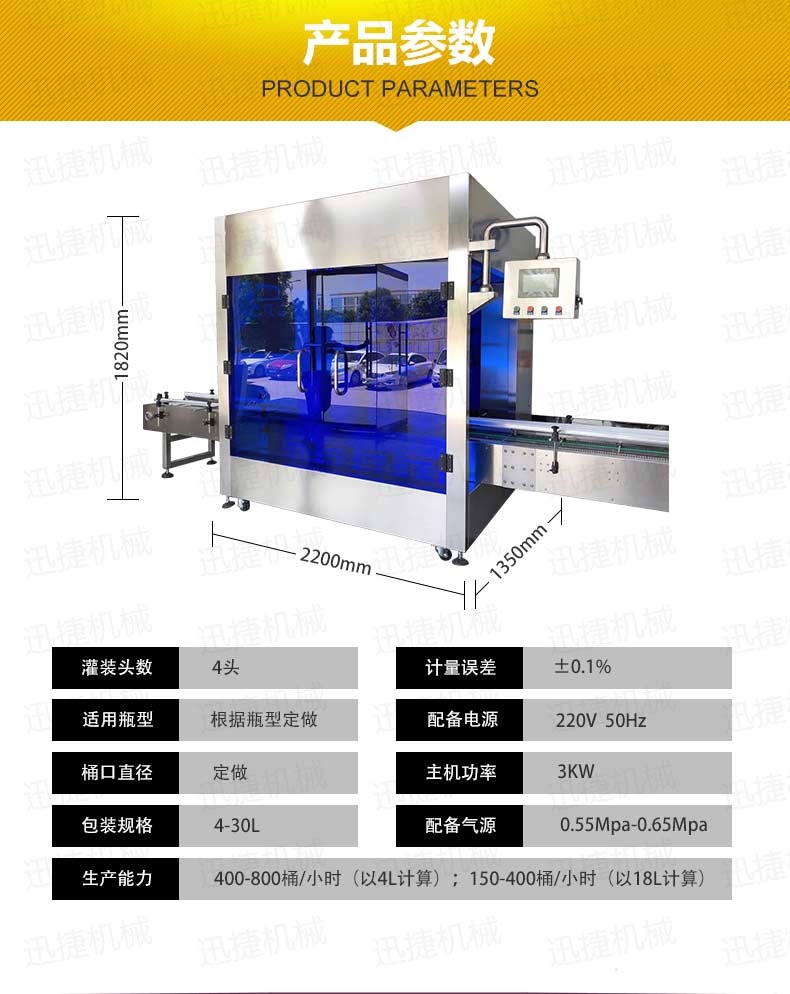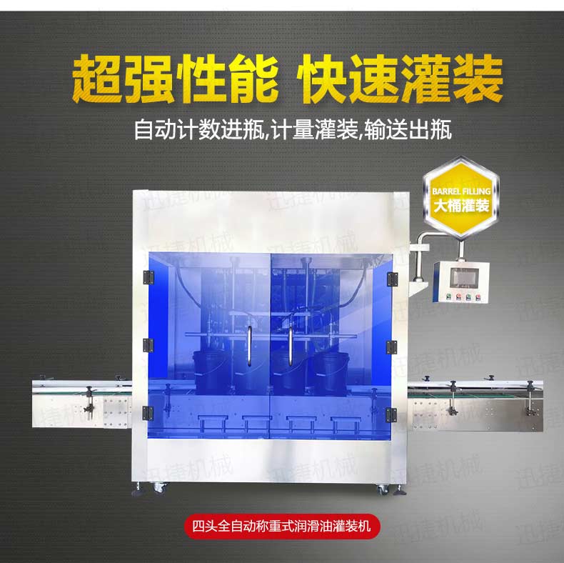 機油灌裝機適用于對4kg-25kg汽車用品類產品:潤滑油、防凍液、車用尿素等液體灌裝。自動完成計數進瓶、計重量灌裝、輸送出瓶等一系列操作。 特別適用于潤滑油、水劑、食用油的定量灌裝,是食品,醫藥,化妝品以及精細化工等行業的理想灌裝機。本機采用可編程控制器(PLC)、高速工控組態軟件進行實時監控的控制,使用調節方便。整機按GMP標準要求制作,各管路連接采用快裝方式,拆卸清洗方便,與物料接觸部位及外露部位均采用不銹鋼制造。整機安全、環保、安全、美觀、能適應各種不同環境工作。